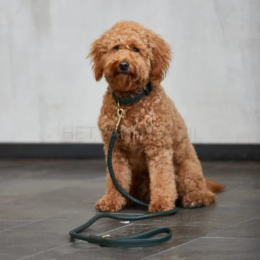 Exclusieve, met de hand gevlochten hondenhalsband van zacht, hoogwaardig leer in een elegante donkergroene kleur en hoogwaardig messing beslag.