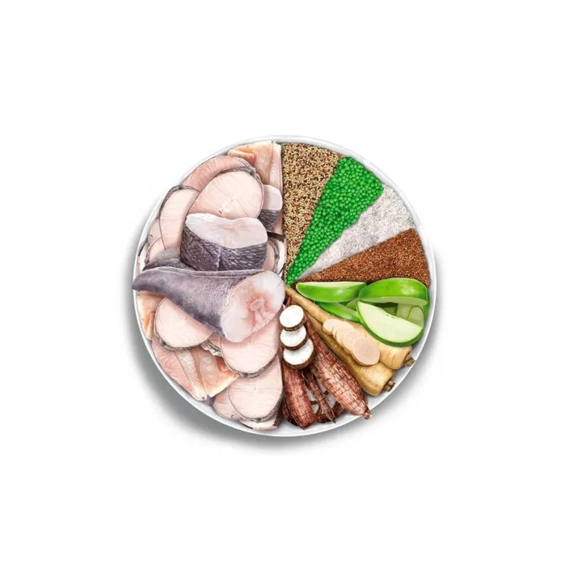 Composition: Fresh white fish 55%, rice, peas, pea protein, potato protein, quinoa 2%, fish hydrolyzate, yeast, parsnip 1%, linseed, chicken oil, mineral substances, apple 1%, psyllium, fish oil, inulin (FOS), mannan oligosaccharides (MOS), citrus extracts, turmeric 0.05%, chamomile, Yucca schidigera.