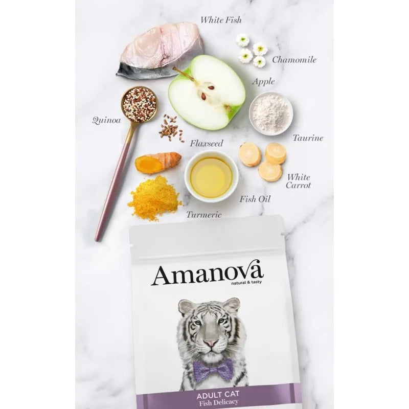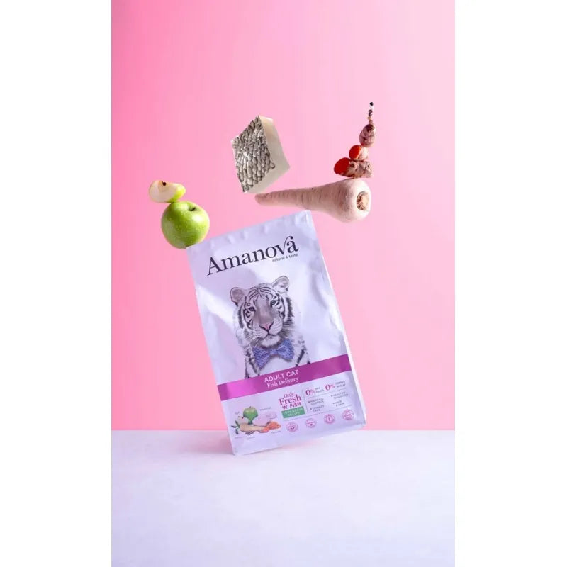 Amanova Adult Fish Delicacy is natural and complete food for all types of adult cats, without meat meal and dried meat. It contains minerals, dietary fiber and special ingredients such as psyllium, probiotics, quinoa and fish oil that ensure kidney function, digestion and prevent the formation of hairballs.