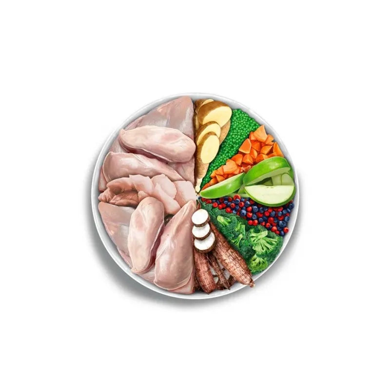 Composition: Fresh turkey 55%, peas, potato, pea protein, potato protein, apple, pumpkin 2%, hydrolyzed poultry liver, yeast, broccoli 1%, chicken oil, minerals, carob, blueberries 0.30%, fish oil, psyllium, inulin (FOS) , mannan oligosaccharides (MOS), citrus extracts, turmeric 0.05%, chamomile, Yucca schidigera.