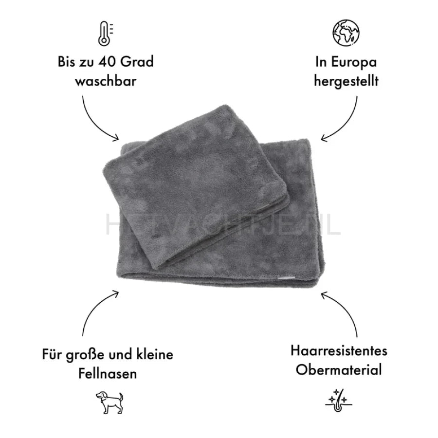 Extra pluizige hondendeken met twee lagen knus donkergrijs pluche voor behaaglijke momenten. Robuuste, vuilafstotende polyestervezels maken het duurzaam en gemakkelijk te onderhouden - gewoon machinewasbaar.